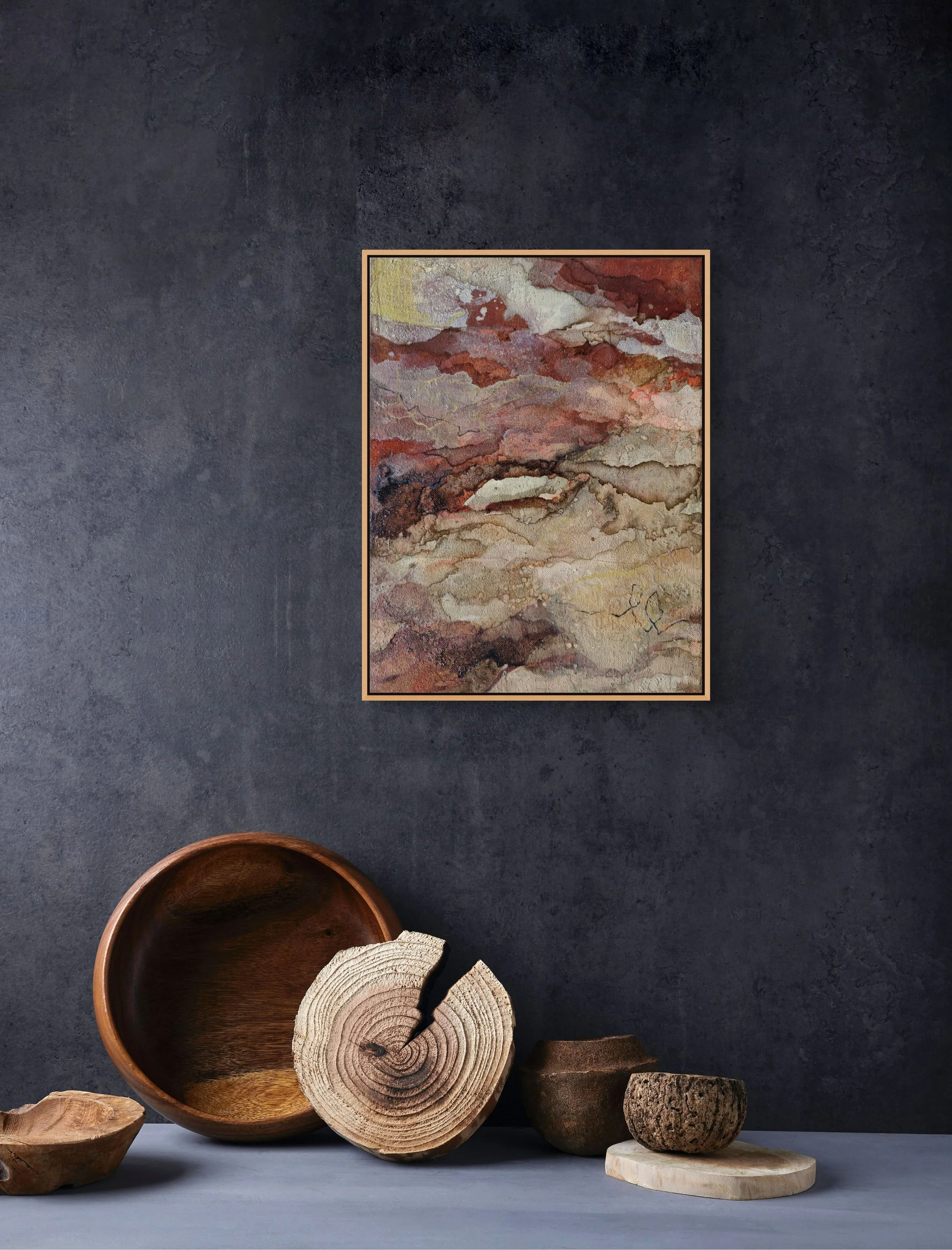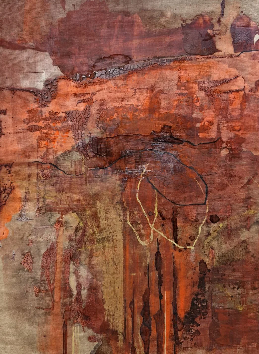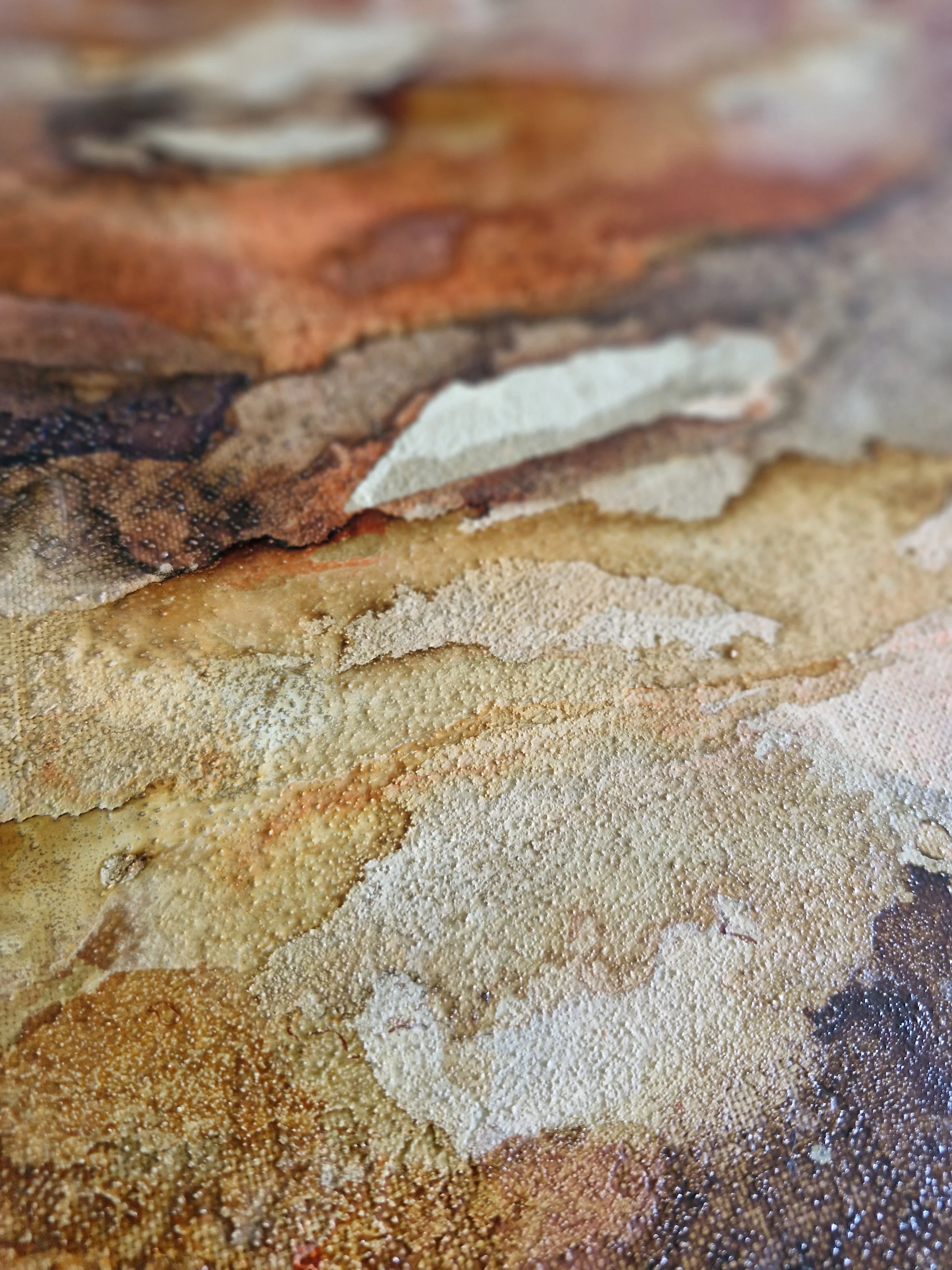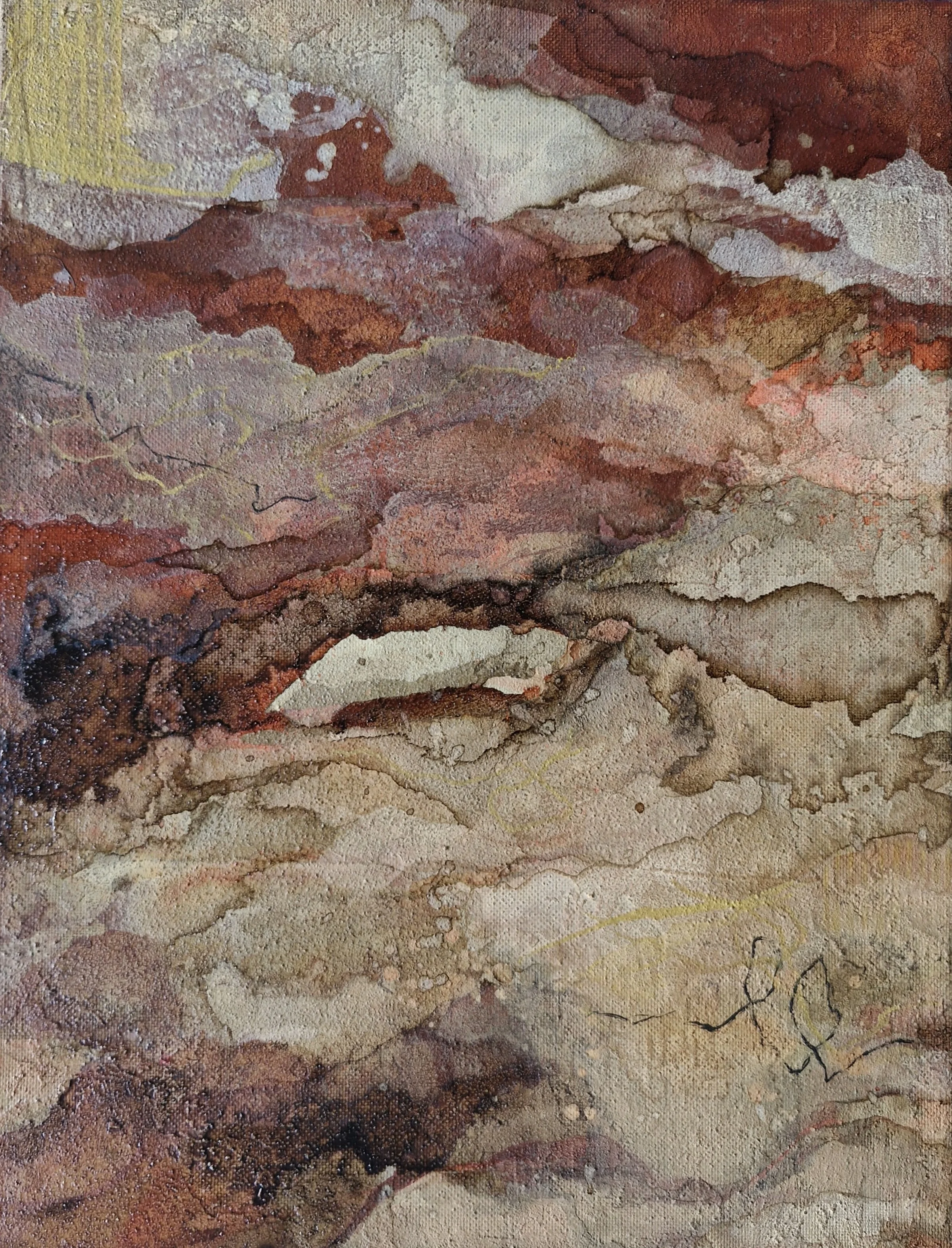 (coffee, textured sand, acrylic, oil pastel) on canvas